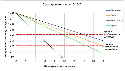 Ниже приведена сравнительная диаграмма снижения напряжения холостого хода у аккумуляторных батарей различной конструкции в процессе их хранения без подзарядки: